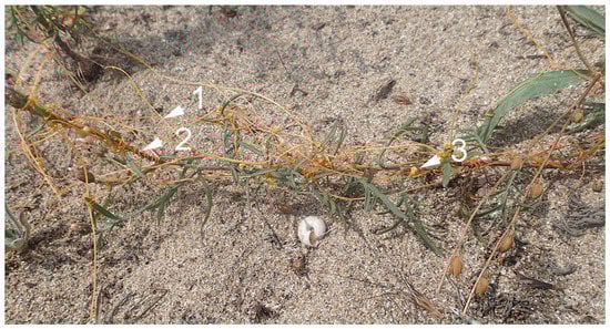 Cuscuta campestris, parasitizing Centaurea arenaria on a sand dune. Bulgarian Black Sea coast, 42°13′46″ N; 27°46′32″ E, July, 2018. White arrows show (1) the parasite stems, (2) site of infection and (3) inflorescence.