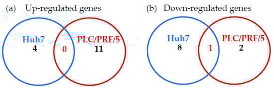 Differential expression of Toll-like receptor signaling pathway-related genes in Huh7 and PLC/PRF/5 cells treated with zinc chloride: (a) significantly upregulated genes compared to control; (b) significantly downregulated genes compared to control.
