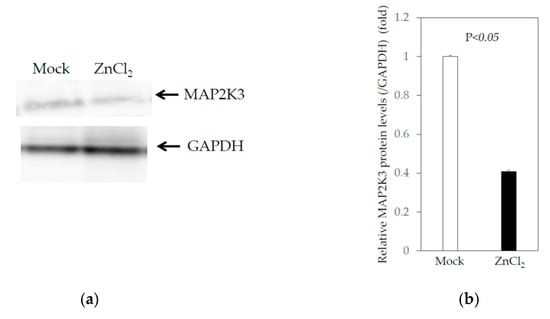 The induction factors of the genes studied following the treatment of human hepatoma cell lines with zinc chloride ranged from 1.07 to 1.45, which seemed relatively low, as did the downregulation factors: all were less than 2, even if they were statistically significant (Table 1 and Table 2). Compared to the control cells, MAP2K3 mRNA expression was reduced by 10 and 14% in Huh7 and PLC/PRF/5 cells, respectively, following treatment with 5 μM zinc chloride (Table 1 and Table 2). We also examined whether MAP2K3 protein expression was downregulated in Huh7 cells treated with 5 μM zinc chloride for 24 h (Figure 2a,b). Of note, zinc chloride downregulated MAP2K3 protein expression by 40.1% compared to the mock control. The discrepancy of the reduction after the zinc chloride treatment between the mRNA and protein levels may be associated with the ubiquitin–proteasome pathway [].