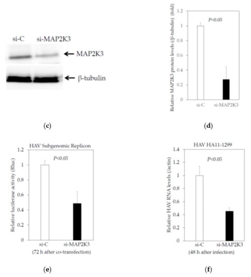 Plasmid pT7-18f-LUC, a replication-competent HAV replicon containing an open reading frame with firefly luciferase flanked by the first four amino acids of the HAV polyprotein and by 12 C-terminal amino acids of VP1, followed by the P2 and P3 domains of the HAV polyprotein (HAV genotype IB strain HM175 18f, GenBank Accession No. M59808) were also kindly provided by Prof. Gauss-Müller, Ph.D., University of Lübeck, Germany. Approximately 1.0 × 105 HuhT7 cells were seeded on 6-well tissue culture plates (Iwaki Glass, Tokyo, Japan) 24 h prior to the transfection. Plasmid pT7-18f-LUC (0.2 μg/well) with 50 μM si-MAP2K3 or 50 μM si-C were transfected into HuhT7 using Effectene transfection reagent (Qiagen, Hilden, Germany) according to the manufacturer’s instructions []. After 72 h of transfection, the cells were harvested using a reporter lysis buffer (Promega, Madison, WI, USA), and the firefly luciferase activities were determined by a Picagene system (Toyo Ink, Tokyo, Japan) using a luminometer (Luminescencer-JNR II AB-2300, ATTO, Tokyo, Japan).