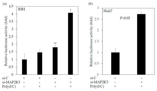 Knockdown of mitogen-activated protein kinase kinase 3 (MAP2K3) could enhance the interferon-β promoter activities stimulated by polyinosinic–polycytidylic acid (poly(I:C)). (a) IHH cells * p < 0.05 vs. other groups. ** p < 0.05 vs. the control siRNA (si-C) without poly(I:C) group; (b) Huh7 cells.