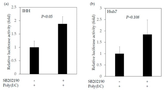 SB202190, a selective inhibitor of the MAP2K3–p38 MAPK signaling pathway, enhanced the interferon-β promoter activity stimulated by polyinosinic–polycytidylic acid (poly(I:C)). (a) IHH cells; (b) Huh7 cells. SB202190 was used at a concentration of 10 nM for 16 h.