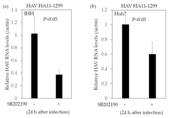 SB202190 inhibits hepatitis A virus (HAV) genotype IIIA HA 11-1299 replication. (a) IHH cells; (b) Huh7 cells. SB202190 was used at the concentration of 5 nM for 24 h.