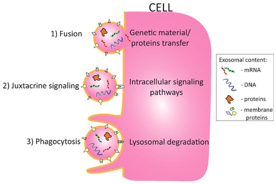 Exosome-target cell interaction: (1) membrane fusion allows for the transfer of both the internal cargo molecules and membrane proteins by merging with the plasma membrane of a target cell; (2) junxtacrine signaling activates intracellular signaling pathways through ligation of target cell membrane receptors with exosome membrane ligands; (3) phagocytosis allows for the internalization of the whole exosome by target cell. It allows for the lysosomal degradation of exosomes. The biological effects of exosomes’ action depend on a type of interaction with the target cell [].