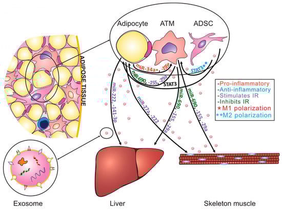 Apart from the adipogenesis process, healthy WAT plays a role in immunoregulation within WAT tissue. The population of adipose tissue macrophages (ATMs) is a crucial regulator of local and systemic inflammatory responses. Depending on the polarization of macrophages, the inflammation process may be strengthened or weakened; therefore, two main subtypes of macrophages—M1 and M2—were identified. M1 macrophages are responsible for inflammatory signaling, while the M2 subtype displays anti-inflammatory properties that participate in the attenuation of the inflammatory response. M2 macrophages release anti-inflammatory cytokines such as IL-10 []. Various mechanisms are involved in the control of ATM polarization, and one of them is identified as an exosome-dependent mechanism. WAT cells, such as mature adipocytes or ADSCs, can reprogram ATMs from the pro-inflammatory M1 profile to the anti-inflammatory M2 profile, or vice versa. Adipocyte-derived exosomes rich in miRNA-34a promote the M1 profile [], while ADSCs-derived exosomes rich in STAT3 protein promote the M2 profile [] (Figure 2). Interestingly, M2 macrophages, in turn, produce exosomes enriched with miRNA-690; these improve insulin sensitivity in high-fat diet mouse models [] (Figure 2). Moreover, miRNA exosomal cargo modulates inflammatory processes within adipose tissue. A study by Flaherty et al. suggests that exosomal lipid content and composition may also have an impact on inflammatory regulation within WAT [].