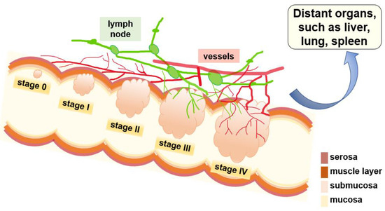 As illustrated in Figure 1, CRC develops in a step-wise manner, starting from precancerous polyps, the earliest stage of CRC and numbered “0”, to the other four main stages, which are numbered I–IV and defined based on tumor size, depth the tumor has grown into the tissue, degree of invasion and metastasis. For instance, as shown in Figure 1, at stage 0, aberrant cells grow up in the innermost layer (mucosa) and form tubercules in the colon or rectum, but these cells are non-cancerous [6,7,8]. At stage I, the tumor has passed the inner layer of the colon or rectum but has not exceeded the wall of the rectum or colon. At stage II, the cancer has grown into the wall of the colon or rectum but not yet reached nearby lymph nodes [9,10,11,12,13,14,15,16]. If the tumors further progress and invade the nearby lymph nodes, they enter stage III. Then, if the tumor cells aggressively diffuse into the lymphatic and vascular pathways and eventually to the distant organs, they have progressed to the advanced stage IV, which has a very poor prognosis and very high mortality.