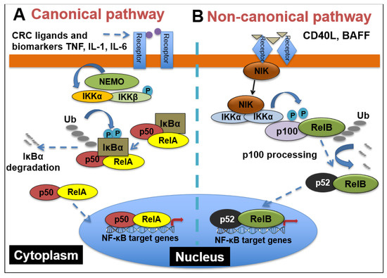 NF-κB signaling pathways. (A) Canonical NF-κB receptors TNFR, IL-1R and TLR are activated by their respective ligands, resulting in IKKβ activation. CRC biomarkers such as IL-6, IL-1 and TNFα can enhance this activity. Activated IKKβ phosphorylates IκBα, which causes its subsequent ubiquitination, separation from the p65/p50 complex and proteasomal degradation. p65/p50 heterodimers then translocate to the nucleus and can bind to their respective DNA elements and promote gene transcription. (B) In the noncanonical NF-kB signaling pathway, activation of noncanonical NF-κB receptors, including RANK and CD40, activates NIK, resulting in IKKα phosphorylation. Activated IKKα then phosphorylates p100, causing its polyubiquitination and processing to p52 via proteasomal degradation. The p52/RelB heterodimer then translocates to the nucleus to bind to its respective DNA elements.