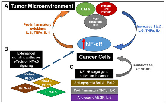 The myriad and varied interactions between NF-κB signaling in cancer and the tumor microenvironment (TME). (A) Increased NF-κB activation in cancer cells can result in the release of proinflammatory cytokines into the TME. This results in stimulation of cancer-associated fibroblasts (CAFs), immune cell infiltrates (such as macrophages) and noncancerous cells to release IL-6 and TNFα, as well as promoting STAT3 activation. Release of these factors back into the TME further enhances NF-κB activation in cancer cells. (B) Mutations of proteins in other pathways or lack of expression of those proteins have been shown to enhance NF-κB activation. These include mutant EGFR and KRAS in the RAS-RAF signaling pathway as well as miRNAs in numerous signaling pathways. Dysregulation of key regulators in NF-κB signaling such as PRMT5 can also contribute to upregulation of NF-κB activity. (C) NF-κB downstream target genes can act to promote a proinflammatory microenvironment by promoting the release of antiapoptotic factors such as Bcl-xL and Bcl-2, proinflammatory factors TNFα and IL-6, angiogenic factors VEGF and IL8 and proinflammatory chemokines. Furthermore, release of pro-inflammatory cytokines can restimulate NF-κB activation. All these factors contribute to a continual stimulation of NF-κB signaling and an increasingly pro-inflammatory environment.