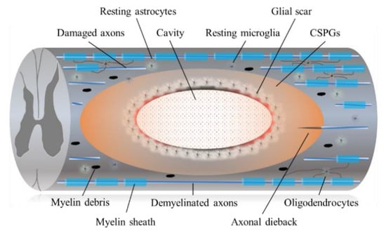 It is widely recognized that regeneration of the adult mammalian central nervous system (CNS), including the spinal cord, is difficult due to its limited plasticity [13]. In the epicenter of a CNS lesion, a cavitation occurs that is surrounded by connective scar tissues containing cerebrospinal fluid. The phenotype of reactive astrocytes changes into scar-forming astrocytes that impede regenerating axons from crossing the lesion. Some inflammatory immune cells remain around the lesion even in the chronic phase of SCI (Figure 1).