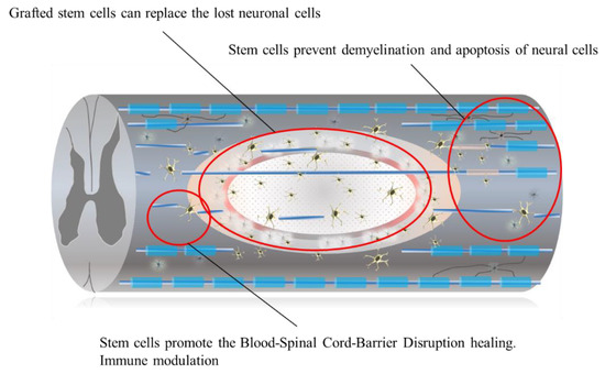 Grafted stem cells can replace the lost neurons, oligodendrocyte, and astrocytes. They prevent demyelination and apoptosis of neural cells they can modulate the immune response and also promote the blood–spinal cord barrier disruption healing.