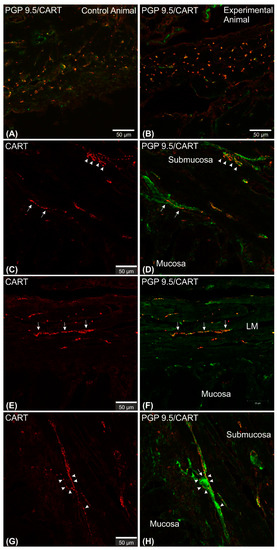 - Bulc, M.; Gonkowski, S.; Calka, J. Expression of Cocaine and Amphetamine Regulated Transcript (CART) in the Porcine Intramural Neurons of Stomach in the Course of Experimentally Induced Diabetes Mellitus. J. Mol. Neurosci. 2015, 57, 376–385. [Google Scholar] [CrossRef] [PubMed]