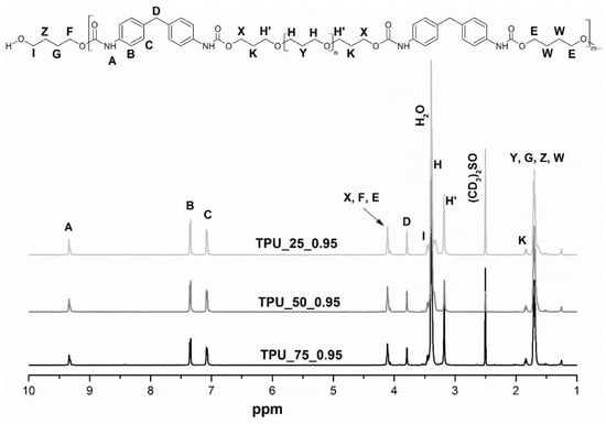 Chemical compositions of thermoplastic polyurethanes were determined via 1H NMR. For illustration, 400 MHz 1H NMR spectra with a description of specific signals of the TPUs dissolved in DMSO-d6 (2.5 ppm) are demonstrated in Figure 1. The low-intensity signal at 9.35 ppm is assigned to the -NH in the urethane group. Two peaks appeared at 7.31 and 7.06 ppm, corresponding to the protons with two kinds of environment in the benzene ring, which indicates that the ring is substituted at the 1 and 4 positions. The CH2 located between the aromatic rings of MDI gives a characteristic signal at 3.77 ppm. The peaks at 1.70 and 3.17 ppm correspond to the CH2 of polyether diol and chain extender in the polymer chain. The signal at 4.09 ppm denotes that another kind of H in the main chain located next to the oxygen is also present in the structure of this type of material. On the basis of the analysis, it can be confirmed that the chain extender is OH-terminated diols. This is evidenced by the lack of peaks belonging to the urea appearing in the spectra [].