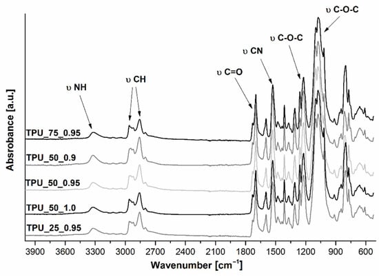 The chemical structure of TPUs was also examined via FTIR spectroscopy, and the spectra are presented in Figure 2. In general, all the obtained materials showed the presence of characteristic groups typical for polyurethanes and possessed similar chemical structures. The absorption bands assigned to the presence of -NCO (2270 cm−1) and -OH (3300–3500 cm−1) groups were not observed, suggesting that the polyaddition reaction between hydroxyl and isocyanate groups occurred completely. The peak with the maximum at 3325 cm−1 is assigned to the stretching vibration of -NH moieties in the urethane groups in the area of hydrogen bonds belonging to the hard segments. C-H asymmetric and symmetric stretching vibrations in the -CH2 groups were observed as bimodal bands with the maxima at 2858 and 2959 cm−1, respectively. The band at 1413 cm−1 is associated with the deformation vibrations of the C-H moieties. Moreover, the spectra showed a characteristic band between 1751 and 1640 cm−1 with two maxima, the bands at 1529 and 1310 cm−1, which are assigned to the stretching vibration of C=O, bending vibration of N-H in the -C-NH group, and stretching vibration of C-N, respectively []. It is worth noting that in the case of polyurethanes, the vibration band in the carbonyl region can be considered a sum of three peaks []. Typically, the bands range from 1640 to 1751 cm−1 and refer to the amide-I region. The absorbance at 1731 cm−1 is assigned to the free carbonyl group, whereas the peak at 1697 cm−1 is characteristic of the hydrogen-bonded C=O group in the crystalline phase of the hard segment domains []. Moreover, in the FTIR spectra of this type of material, the hydrogen-bonded C=O moiety stretching band in the amorphous phase was imperceptible []. The stretching vibrations of C-O-C in a polyether polyol chain could be coupled with the absorbance at 1080 cm−1. A characteristic band for the out-of-plane bending vibration of C-H in the 1,4-disubstituted aromatic ring is the absorbance at 817 cm−1. This peak can be coupled with the absorption band at 1596 cm−1, which is assigned to the skeletal vibration of C=C in the aromatic ring [].