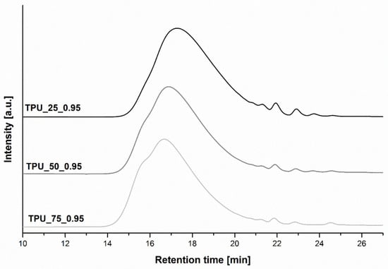 The molecular weight distribution depended primarily on the molar ratio of the used components and the used catalyst, but also the reaction conditions such as the used temperature, pressure, and stirring, which had large impacts on the dispersity. Size-exclusion chromatography was used to characterize the number and weight average molecular weights and dispersity of the synthesized poly(ether-urethane)s. The impact of the different composition of the soft segments on the molecular structure is shown in Figure 3. Table 1 presents the statement of the SEC results. Distinct, broad peaks at similar retention times for all measured green thermoplastic polyurethane elastomers are visible on the graph. It is seen that with the higher amount of the poly(trimethylene glycol) with Mn at 2700 g/mol at the chemical structure of green TPUs, the synthesized TPUs revealed an extended retention time, from 16.72 min for the TPU_75_0.95 specimen to 17.30 min for the TPU_25_0.95 sample. It is well known that macromolecules with higher average molecular weights are characterized by a lower retention time. It is also seen in Table 2, in which increasing values of Mn and Mw are visible with decreasing retention time. The TPU based on 25 wt% of PO3G with an Mn of 1000 g/mol (TPU_25_0.95) was characterized by a lower value of Mn—ca. 20,000 g/mol and Mw ca. 40,000 g/mol. Other materials, with a higher amount of PO3G with Mn equaling 1000 g/mol at the soft segment structure, were characterized by higher values of Mn—ca. 28,000 g/mol and Mw ca. 50,000 g/mol for TPU_50_0.95 and ca. 55 000 g/mol for TPU_75_0.95, respectively. It is probably due to the higher mobility of the shorter chains that can react, compared to longer chains, whose mobility is hindered due to the chains’ length and their lower reactivity. Table 2 also shows the impact of the different [NCO]:[OH] functional groups’ molar ratio, used during the chain extender step, on the average molecular weight and dispersity of the green TPUs. The results allowed the confirmation that with higher [NCO]:[OH] molar ratio, the obtained TPUs are characterized by higher values of Mn and Mw. The highest value was exhibited by the sample TPU_50_1.0, Mn ca. 45,000 g/mol and Mw ca. 91,000 g/mol. It is known from the basic chemical reaction kinetics equations that with the use of a monomer molar ratio of 1, macromolecules characterized by the highest average molecular weight are synthesized. It can be expected that with increasing [NCO]:[OH] molar ratio, values of Mn and Mw will decrease.