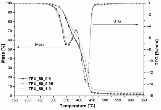 Thermal properties of polyurethanes have a large impact on their future application and mainly depend on the type of monomers used for their preparation, synthesis methods, and conditions or molar ratio of the main components []. The thermogravimetric measurements were performed in order to determine the beginning of thermal decomposition (T5%) of the prepared TPUs and the temperature at the maximum decomposition rate for each degradation step or char yield. For green TPUs synthesized in different [NCO]/[OH] molar ratios and by using a 1:1 mixture of two prepolymers, the thermograms of mass loss and DTG versus temperature were plotted, and they are shown in Figure 4, whereas the effect of different weight fractions of the two prepolymers on the thermal characteristic of TPUs is presented in Table 2.