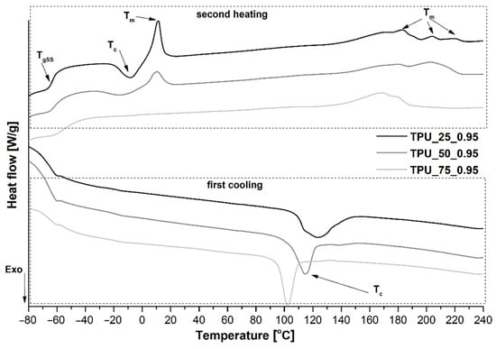 DSC was used to investigate the thermal behavior of the obtained TPU and to confirm their segmented structure. The thermal effects such as the glass transition of flexible segments, melting, and crystallization (including cold crystallization) were noticed and are presented as endothermic and exothermic curves in Figure 5, while all determined values of the mentioned parameters are listed in Table 3. The influence of each prepolymer contribution that was used for TPU synthesis was revealed in the glass temperature of flexible segments and in melting temperature of SS and HS. Increasing the prepolymer content based on polyol PO3G2700 led to a decrease in TgSS and favored the cold crystallization of SS because of the higher amount of the methylene sequences in the structure of the PO3G2700 polyol and the same mobility of the polymer chains []. The sample TPU_25_0.95 revealed the highest total ΔHc and a high ΔHm, which suggests that these materials are characterized by the highest degree of phase separation []. With increasing prepolymer contribution based on the PO3G1000 polyol, this effect disappeared and, in consequence, in the case of TPU_75_0.95, the melting temperature of SS was also invisible on the endothermic curve. Analyzing the hard segments, it is impossible to determine the glass transition temperature TgHS, which suggests the lack of well-ordered hard domains in hard segments. The melting of HS was registered as broad multiple peaks. Depending on the prepolymer fractions, the melting peaks are characterized by two (samples: TPU_50_0.95 and TPU_75_0.95) or three maxima (TPU_25_0.95). This finding indicates a disordering in the hard segments, and partial miscibility of the hard phase in soft segments, which is also confirmed by a decrease in the enthalpy of crystallization. The difference in the behavior of the melting of TPU materials suggests that they have different physical origins. The first melting peak at the lowest temperature was assigned to the ordered structure present in the hard phase, and peaks at the higher temperature were related with phase mixing of SS and HS [].