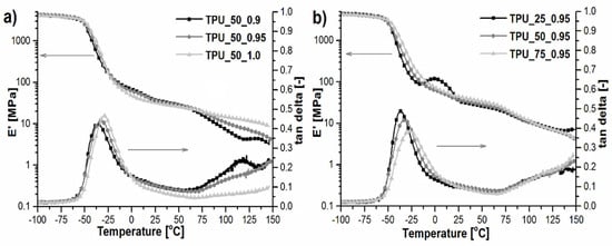 Dynamic mechanical analysis supports the thermal analysis of TPUs in the aspect of their viscoelastic behavior. Figure 6 shows the storage modulus (E’) and tangent delta (tan δ) dependence of temperature for TPUs synthesized by using a different [NCO]/[OH] molar ratio and by using an equal amount of both prepolymers (based on PO3G1000 and PO3G2700) (a), and for TPUs synthesized by using the same [NCO]/[OH] molar ratio and different amounts of both prepolymers (based on PO3G1000 and PO3G2700) (b).