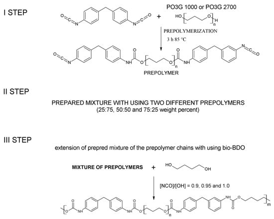 Green TPUs based on poly(trimethylene glycol) with molecular weights of 1000 and 2700 g/mol were synthesized using a two-step method [,,]. The scheme of the prepolymer preparation is presented in Figure 7. The percentage of the unreacted NCO groups in both prepolymers equaled 7%, which was determined according to the ISO 14896:2010 standard. The ratios of both different prepolymers based on the two mentioned bio-based polyols with different Mn values were determined as 25:75, 50:50, and 75:25 wt.%. Bio-based 1,4-butanediol was used as a chain extender. DABCO was used as a catalyst in the solution at bio-BDO with a 0.3 wt.% concentration. Green TPUs were obtained at three [NCO]/[OH] molar ratios—0.9, 0.95, and 1.0. The content of hard and soft segments, formulation, molar ratio of [NCO]/[OH], and sample codes that have been used throughout the work has been presented in Table 7.