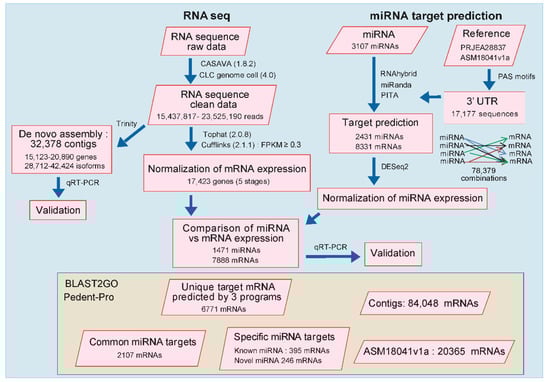 Flowchart representing the overall process of the current study. In silico analysis of miRNA-targeted mRNA prediction from the reference genome (ASM18041V1a) []; further combinations of miRNA-targeted mRNAs were elucidated. Illumina sequence data were used as the raw data; these data were cleaned using multiple software programs (RNAhybrid, miRanda, and PITA) and differentially expressed mRNAs were analyzed with a Venn diagram and heatmap. Expression levels of miRNA and mRNA based on sequencing results were normalized using DESeq2 and the fragments per kilobase of transcript per million mapped reads (FPKM) methods, respectively. Further miRNA-targeted mRNAs were validated through qRT-PCR for all developmental stages of M. incognita. Sequencing results were annotated with BLAST2GO using data for specific, common, and unique miRNA-targeted mRNAs.