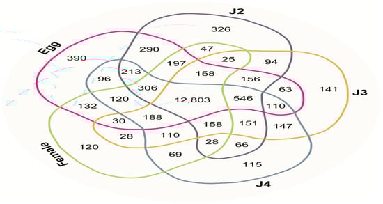 Venn diagram illustrating the distribution of reads across the developmental stages of M. incognita (egg, J2, J3, J4, and female), indicating commonly expressed and stage-specific mRNAs (FPKM ≥ 0.3).