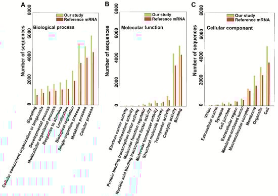 Comparison of top Gene Ontology (GO) mapping results. The results are summarized into three main categories: (A) biological process, (B) molecular function, and (C) cellular component. Dark green color indicates the number of sequences used in our study; dark red color indicates the number of sequences in the reference study (ASM18041V1a).