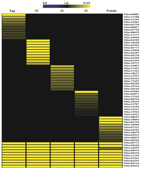 All FPKM values obtained through stage-specific analysis were subjected to two clustering processes based on the most abundant sequences and overall expression profiles (Figure 4 and Figure S3, respectively) using a heatmap. The first clustering analysis included 60 highly expressed genes, with 10 genes specific to each stage and 10 genes commonly expressed at all stages. The second clustering method, based on overall gene expression profiles at all stages, revealed grouping of mRNA from the J3 and J4 stages, which formed a subclade similar to the egg-stage mRNA profile. Overall, mRNA from the female stage was distinct from other stages of nematode development.