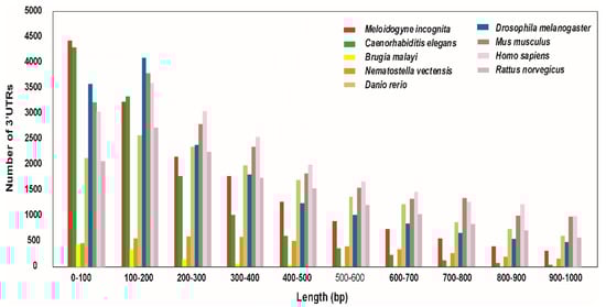 Comparison of 3′ UTR sequence length distributions among nematode species (C. elegans, M. incognita, and B. malayi), mammalian groups (human, mouse, and rat) and others (starlet sea anemone, fruit fly, and zebrafish). Overall, M. incognita had longer 3′ UTR sequences than C. elegans, except for sequences 100–200 bp in length.