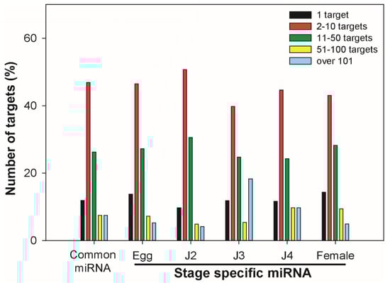 Further analysis was conducted to elucidate the interactions of miRNAs with mRNAs using the whole-genome sequence of M. incognita from the NCBI (ASM18041v1) and WormBase assembly (ASM18041v1a), which resulted in 1471 miRNAs (1218 known, 263 novel) targeting 7888 mRNAs. These miRNAs had a varying number of targets; one miRNA could target one to hundreds of mRNA. More than 40% of miRNAs targeted 2–10 mRNAs, while roughly 20 to 40% of miRNAs targeted 11–50 mRNAs among all stages (Figure 6).