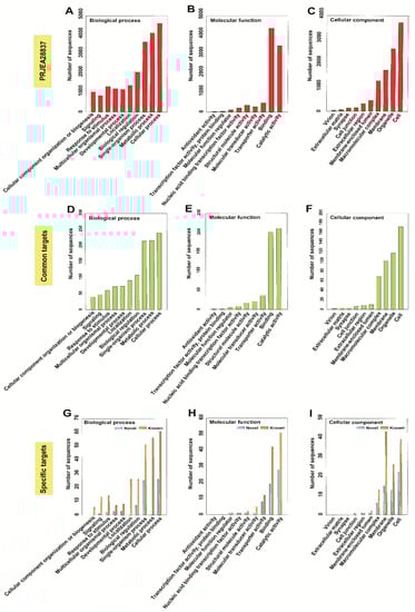 GO analysis indicated that the reference (PRJE28837) mRNA-targeted biological processes included cellular processes, while the molecular function mRNAs were involved in binding and catalytic activity. Among cellular components, mRNA targets included the organelle and cell classes (Figure 7A–C). Similarly, common targets were found in the biological processes of single organism, metabolic, and cellular processes. Common molecular function mRNAs were involved in binding and catalytic activity. Among cellular components, membranes, organelles, and cells were most important (Figure 7D–F). Biological processes of specific (known and novel) miRNA-targeted mRNAs were associated with metabolic processes. Additionally, molecular function mRNAs were involved in transporter, binding, and catalytic activities. Cellular component targets were membrane localized, with commonly expressed miRNAs and cellular mRNAs as targets of specific miRNAs (Figure 7G–I). Overall, all miRNAs observed here targeted mRNAs localized to the cell, organelles, membranes, and macromolecular complexes, with roles in cellular and metabolic processes as well as catalytic, binding, transporter, and molecular transducer activities. At the molecular level, very few targets were related to the nucleic acid-binding transcription factor, molecular function regulator, protein-binding transcription factor, and antioxidant activity terms. At the cellular level, the membrane-enclosed lumen, extracellular region, cell junction, synapse, and virion were represented. In the biological process category, most targets were related to localization, developmental process, multicellular organismal process, response to stimulus, signaling, and cellular component organization or biogenesis (Figure 7G–I).