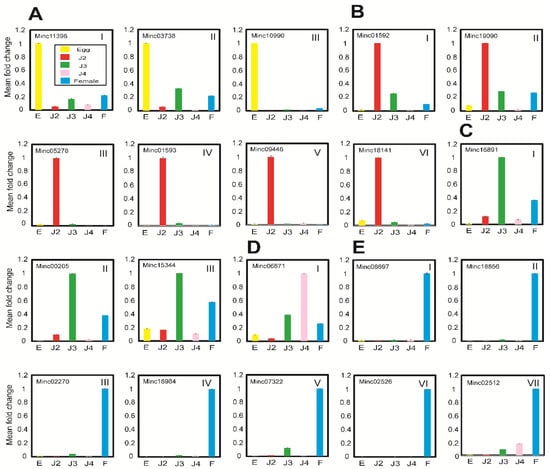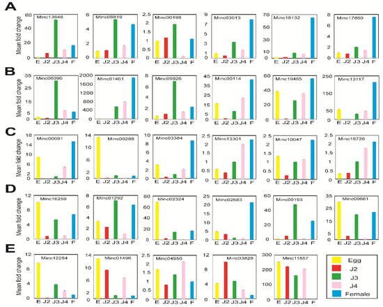 Real-time expression of stage-specific highly expressed mRNAs. (A) egg stage; (B) J2 stage; (C) J3 stage; (D) J4 stage; (E) female stage. Bar color indicates developmental stage: yellow, egg stage; red, J2 stage; green, J3 stage; pink, J4 stage; and blue, female stage. E: Egg; F: Female.