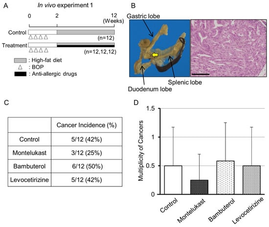 Montelukast exhibited a suppressive effect on pancreatic carcinogenesis in the hamster pancreatic cancer model. (A) Experimental design for the BOP-induced pancreatic cancer model in hamster. Anti-allergic drugs: montelukast, bambuterol and levocetirizine. (B) Representative images of pancreatic cancer in the hamster model (the cancer lesion is indicated by the yellow arrow) and H&E staining of the cancer lesion. Bar = 100 µm. (C) Cancer incidence and (D) multiplicity in the four groups.