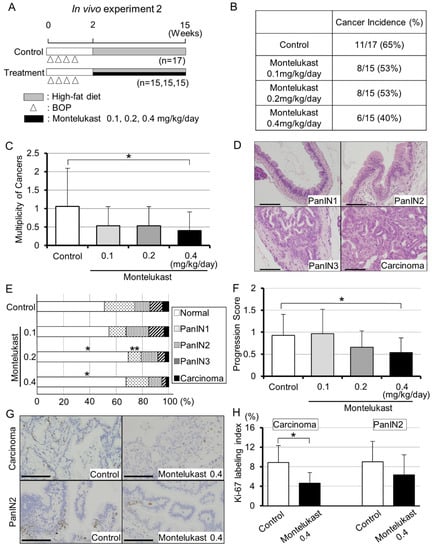 Several reports have uncovered the anti-cancer effects of montelukast [5,6,7,8,9,10]. Therefore, we focused on the suppressive effects of montelukast and performed further investigations. The design of in vivo experiment 2 is shown in Figure 2A. There was no significant difference in the mean body, liver and kidney weight among the groups (Supplementary Figure S2 and Supplementary Table S3). Cancer incidence at each montelukast concentration is shown in Figure 2B. The multiplicity of cancers was significantly decreased in the high-dose montelukast group (0.4 mg/kg/day) compared with the control group (Figure 2C and Supplementary Table S4). Representative images of the pancreatic lesions are shown in Figure 2D. The progression of pancreatic intraepithelial neoplasia (PanIN) lesions was also significantly suppressed in the high-dose montelukast group compared with the control group (Figure 2E,F and Supplementary Table S5). The Ki-67 labeling index was significantly lower in the pancreatic carcinomas in the high-dose montelukast group than those in the control group (Figure 2G,H).