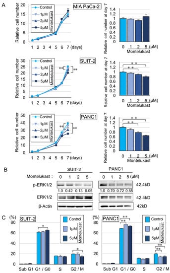 Montelukast suppressed cellular proliferation of PDAC cells with down-regulation of p-ERK. (A) Graphs of relative cell number compared with day 1 (left) and bar graphs of relative cell numbers compared with the control at day 7 (right) quantified by CellTiter 96 in the low-CYSLTR1-expressing cell line (MIAPaCa-2) and high-CYSLTR1-expressing cell lines (SUIT-2 and PANC1). PDAC cells were treated with montelukast at day 1. Data are presented as mean ± SD, n = 3 per group, ** p < 0.01 compared with controls. (B) Immunoblot assay of p-ERK in high CYSLTR1-expressing cells (SUIT-2 and PANC1) treated with montelukast for 6 days. (C) Cell cycle analyses of SUIT-2 and PANC1. Data are presented as means ± SD. Experiments were performed in triplicate. * p < 0.05 and ** p < 0.01 compared with controls.