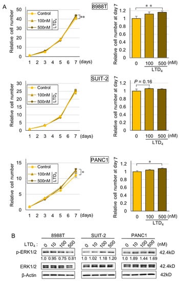 LTD4 increased cellular proliferation of PDAC cells with an accumulation of p-ERK. (A) Graphs of relative cell number compared with day 1 (left) and bar graphs of relative cell numbers compared with controls at day 7 (right) quantified by CellTiter 96 in high-CYSLTR1-expressing cells (8988T, SUIT-2 and PANC1). PDAC cells were treated with LTD4 at day 1. Data are presented as mean ± SD, n = 3 per group, * p < 0.05 and ** p < 0.01 compared with controls. (B) Immunoblot of p-ERK in high-CYSLTR1-expressing cells treated with LTD4 for 24 h.