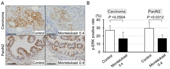 Based on our observations that montelukast suppressed p-ERK accumulation in human PDAC cells, we performed immunohistochemical analyses for p-ERK expression in hamster pancreatic lesions. The positive rate for p-ERK tended to be lower in the high-dose montelukast group than those in the control group (Figure 6A,B).