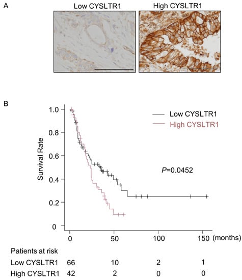 High CYSLTR1 expression is associated with poor prognosis in PDAC patients. (A) Representative images of CYSLTR1 immunohistochemistry in human PDAC. Images of the low-CYSLTR1-expressing group and the high-CYSLTR1-expressing group are shown. Bars = 100 µm. (B) Kaplan–Meier overall survival curve in PDAC patients with high CYSLTR1 expression and low CYSLTR1 expression (n = 108). p-value was calculated by log-rank test.