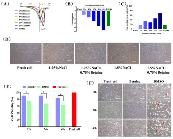 The cytotoxicity of betaine and DMSO on UCMSCs was tested by a co-incubation experiment. Figure 1E,F showed that UCMSCs incubating with 2% betaine at 37 °C for 12, 24, and 48 h maintained viabilities of 90.87 ± 4.65%, 90.62 ± 4.43%, and 84.39 ± 4.60%, respectively, and normal morphology. On the contrary, DMSO was toxic and resulted in a drastic decreases in viability of 74.16 ± 5.12%, 66.04 ± 3.33%, and 63.37 ± 7.40%, respectively. Moreover, the detachment and severe deformation (red arrow) in DMSO-incubated UCMSCs can be observed in Figure 2F.
