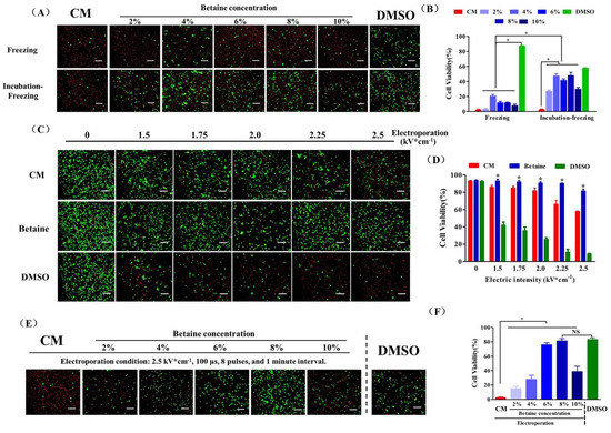 UCMSC cryopreservation. (A) Fluorescence images and (B) cell survival rate of UCMSCs cryopreserved using culture medium (CM), 2–10% betaine solution (betaine), or 10% DMSO solution (DMSO). (C) Fluorescence images and (D) cell survival rate of UCMSCs electroporated with culture medium (CM), 8% betaine solution (w/v) (Betaine), or 8% DMSO (v/v) (DMSO) as buffer in the range of electric intensity from 0 to 2.5 kV × cm−1. *: Betaine group compared with culture medium group and DMSO group. (E) Fluorescence images and (F) cell survival rate of UCMSCs recovered from B–E cryopreservation (CPA solution: culture medium, CM; 2–10% betaine solution, Betaine; Electroporation condition: 2.25 kV × cm−1, 100 μs, 8 plus and 1 min interval) or DMSO-based cryopreservation (DMSO). Green, live cells; red, dead cells. Scale bar = 200 μm. Value = mean ± standard deviation, n = 3. * p < 0.05, NS: no significance.