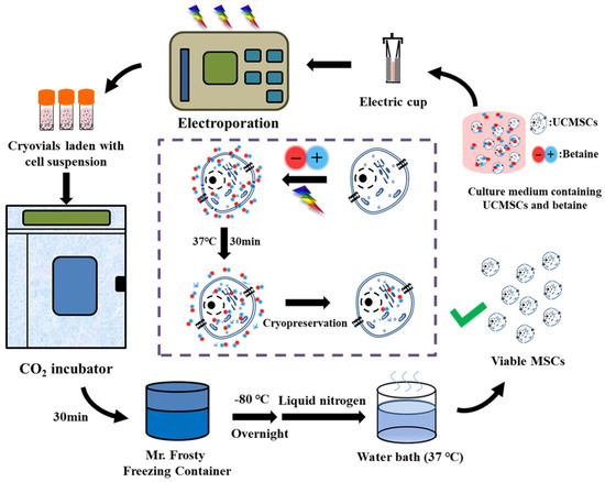 Procedure and proposed mechanism of UCMSCs cryopreservation by using betaine combined with electroporation.