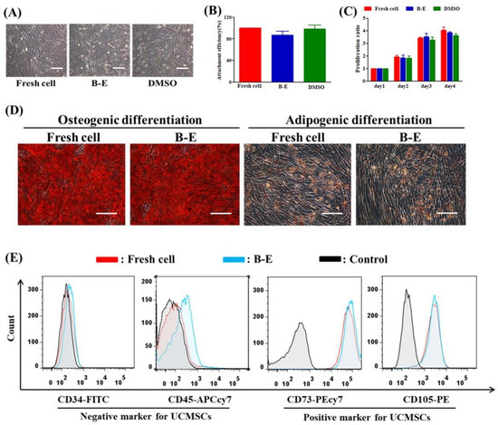 Evaluation of UCMSCs functions. (A) Morphology. (B) Attachment efficiency. (C) Proliferation ability. (D) Qualitative assessment of osteogenic and adipogenic differentiation (stained by Alizarin Red and Oil Red O, respectively). (E) Flow cytometry quantification of the expression of CD34 and CD45 (negative markers), CD73, and CD105 (positive markers). Control group refers to UCMSCs without cryopreservation and staining process. Scale bar = 200 μm. Value = mean ± standard deviation, n = 3.