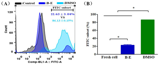 In this work, we assessed the antioxidant activity of betaine and DMSO to suppress the cellular overproduction of ROS caused by cryopreservation. As shown in Figure 5A,B, compared to fresh UCMSCs, an apparent increase in the ROS level was observed in post-thaw UCMSCs. However, the ROS level of UCMSCs in B–E (22.36 ± 3.04%) was significantly less than that of UCMSCs in DMSO (86.13 ± 0.15%).