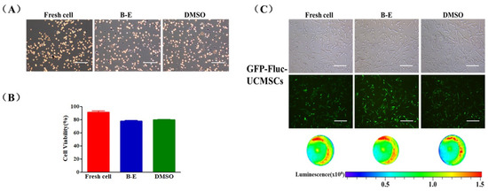 Live/Dead Kit (L34964, Thermo Fisher, Waltham, MA, USA): the UCMSCs were re-suspended using a calcein-AM/ethidium homodimer-1 reagent mixture solution and incubated at room temperature for 30 min in darkness. A 20 μL cell suspension was then transferred to a cell counting chamber (Countstar, Shanghai, China) to photograph the live/dead staining using an inverted fluorescence microscope. Finally, the numbers of live cells (green) and dead cells (red) were measured using ImageJ. As for GFP-Fluc-UCMSCs cryopreservation, trypan blue stain (C0040, Solarbio Science and Technology, Beijing, China) was used to test cell viability. In detail, 0.4% trypan blue was mixed with cell suspension (9:1, v:v) for 3 min, then 20 μL mixture was loaded into a cell counting chamber to photograph the stain picture. Dead cells were stained with blue. The cell survival efficiency was calculated as the percentage of live cells out of the total number of cells.