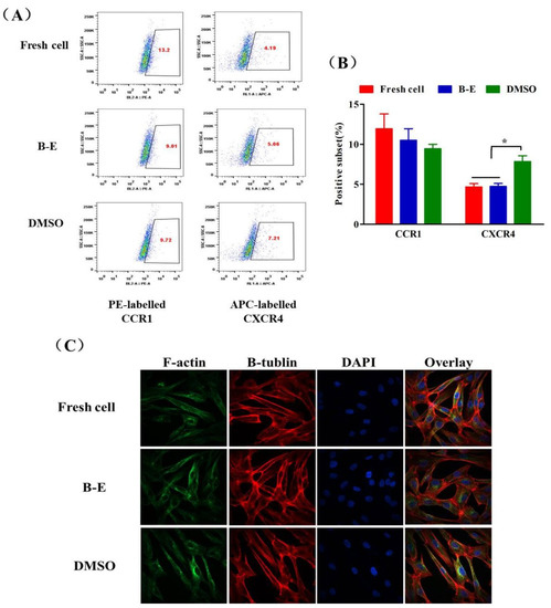 In a further study, we tested the expression of CC chemokine receptor 1 (CCR1) and CXC chemokine receptor 4 (CXCR4) of cryopreserved UCMSCs that were closely related to migration and distribution [41,42,43]. As shown in Figure 8A,B, compared to fresh UCMSCs, the recovered UCMSCs from B–E cryopreservation showed normal expression of these receptors. However, DMSO cryopreservation triggered obvious upregulation of CXCR4. Though the overexpression of CXCR4 has been proven to enhance migration of MSCs [44], this effect was not reflected in the macro monitoring results (Figure 7). We also tested the cytoskeleton integrity of post-thaw UCMSCs through immune fluorescence staining. The F-actin and β-tubulin in the post-thaw UCMSCs was well-organized. No obvious differences were observed in the cytoskeleton of the recovered and fresh UCMSCs (Figure 8C).