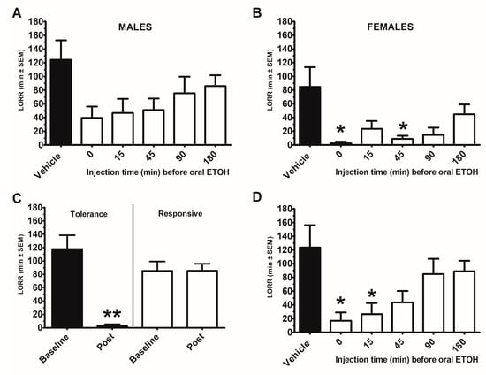Ethanol-induced loss of righting reflex (LORR) was assessed in male and female mice (n = 8) following ethanol PO with and without DHM IP 50 mg/kg administration at 0, 15, 45, 90, and 180 min prior to ethanol administration. There was an effect for sex (F (1, 11) = 7.5, p < 0.05) and time for dose (F (5, 55) = 5.9, p < 0.0001). Females demonstrated reduced LORR (p < 0.05). Male and females were separately analyzed (Figure 1A,B). Males demonstrated an effect for DHM (F (5, 25) = 2.7, p < 0.05), but there was no difference between time of DHM injection. Females also demonstrated an effect for DHM (F (5, 30) = 3.8, p < 0.005), with DHM injected at time 0 and 45 min before oral ethanol reducing LORR compared with vehicle treated mice (p < 0.05). There was a significant reduction in LORR in mice (n = 8; 3 males/5 females) demonstrating tolerance between Baseline (week 1) to Post (week 8) (t (7) = −5.39, p < 0.005), whereas there was no difference in LORR in responsive mice (n = 8; 5 males/3 females; (t (7) = 0.3, p = 0.97)) (Figure 1C). For responsive mice, there was an effect of DHM (F (5, 25) = 4.3, p <0.001) with DHM injected at time 0 and time 15 prior to ethanol PO demonstrated a reduction in LORR (p < 0.05) (Figure 1D).