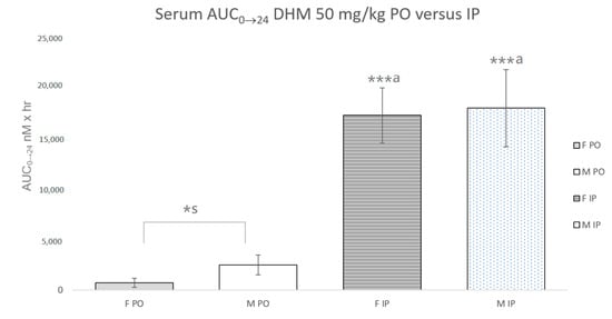 Serum AUC0→24 of DHM 50 mg/kg with oral (PO) and intraperitoneal (IP) administration in male and female mice. *s Statistically significant (p < 0.05) difference between male and female mice. ***a Statistically significant (p < 0.0001) between administration routes of same sex.