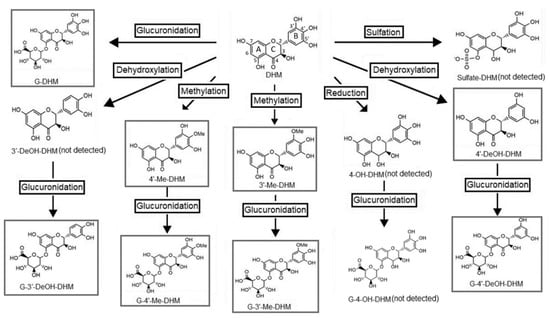Proposed metabolic pathway of dihydromyricetin (DHM) based on detection of metabolites in feces and/or urine samples of rats [,]. Boxed compounds are those that were detected in this study.