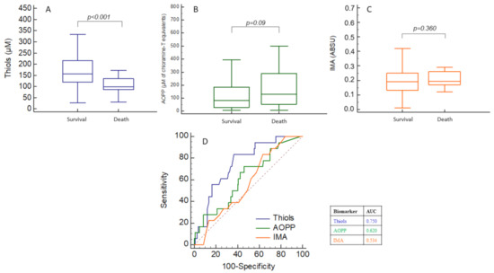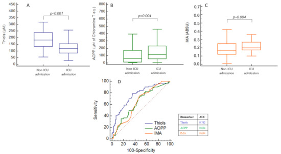 We performed receiver operating characteristics (ROC) curve analysis in order to evaluate the prognostic performances of each biomarker regarding ICU admission. Thiol concentrations were significantly decreased in patients admitted to ICU (121 (85–154) vs. 183 (134–239) µmol/L, p < 0.001), while all other biomarkers (IMA, AOPP, IL-6, PSEP and calprotectin) were significantly increased (Figure 2A–C,E–G).