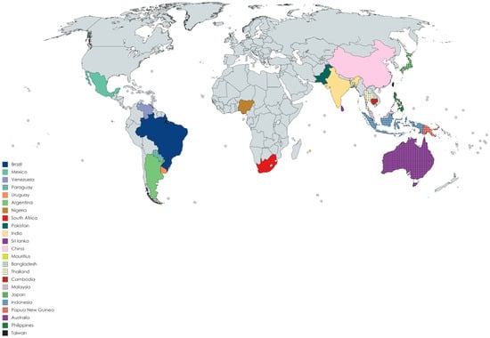 The Mimosa genus belongs to the Fabaceae family of legumes (subfamily: Mimosoideae) and consists of almost 400 species of shrubs and herbs []. The species are distributed mainly in Bangladesh, Indonesia, Malaysia, Japan, India, Pakistan, Sri Lanka, China, Cambodia, Taiwan, Africa (Nigeria, Mauritius, and Reunion Island), Australia, Brazil, Venezuela, Mexico, Philippines, Cuba, northern Central America, Paraguay, Argentina, Uruguay, Thailand, several Pacific Islands, Papua New Guinea, and North America [,,,,,,,,,]. Figure 1 presents the ethnogeographical distribution of the Mimosa species in different countries of the world. Almost 20–25 species of this genus are well known to the world, including Mimosa tenuiflora (Wild.) pior, Mimosa pudica L., Mimosa pigra L., Mimosa caesalipiniifolia Benth., Mimosa hamata Willd., Mimosa diplotricha Sauvalle, Mimosaa xanthocentra Mart., Mimosa artemisiana Heringer and Paula, Mimosa invisa Mart. ex Colla, Mimosa scabrella Benth., Mimosa somnians Humb. and Bonpl. ex Willd., Mimosa bimucronata (DC.) Kuntze, Mimosa verrucosa Benth., Mimosa arenosa (Willd.) Poir., Mimosa humilis Willd., Mimosa rubicaulis Lam., Mimosa linguis, and M. albida Willd. Mimosa ophthalmocentra Mart. ex Benth. (http://mpns.kew.org/MPNS.kew.org 2018; www.theplantlist.org 2017) (Accessed on 18 May 2021). Leaves of this genus may be bipinnate or binate, compound or branched, with one or two pairs of branchlets or much larger branched leaves. Some species have the ability to fold their leaves when touched, with M. pudica being one common example. The flowers may be pink and globular in the form of clusters and with prickles or may be white and grouped in dense heads 3–6.5 mm long. The fruit are lance-shaped with 2–6 articulations. The fruit wall is compressed between the seeds. Huge amounts of starch and calcium oxalate crystals are present in the bark []. Some species are prickly leguminous shrubs []. The plants of this genus usually grow across roadsides, walkways, marshes, and hillsides, and on margins of rivers and lakes on wet soil, where several individuals can form dense aggregations []. The plants are commonly used for ornamental purposes. They also serve as sleeping shelters for animals []. Economically, their wood is used for fence posts, firewood, coal, plywood, particle board, and lightweight containers, and more recently has been introduced in furniture and flooring []. Leaves of the plants are used for poultry diets []. In the food industry, the leaves are used as additives, while in the leather and textile industry they are used as colorants [,]. The plants provide wood for market purposes and add nitrogen in warm-climate silvopasture systems []. This genus has remarkable economic importance in the cosmetics industry []. Traditionally, species of this genus are used in folklore medicines for the treatment of various ailments, including head colds, wounds, toothaches, jaundice, eye problems, fever, weak heart, skin burns, asthma, diarrhea, piles, gastrointestinal ailments, liver disorders (such as hepatitis and diuresis), and respiratory [,,,,] disorders. They are also used as coagulants and in tonics for urinary complaints. The genus Mimosa has been demonstrated to possess various pharmacological activities, including antiseptic, antimicrobial [,], antioxidant [,,,,,], anticonvulsant [], antifertility [], antigout [], anti-inflammatory [,,], antinociceptive [,], antiulcer [], antimalarial [], antiparasitic [], antidiabetic [,], anticancer [,], antidepressant [], antidiarrheal [,], antihistamic [], wound-healing [], antispasmolytic [], hypolipidemic [], hepatoprotective [], hypolipidiemic [], antivenom [], antiproliferative [], antiviral [], and aphrodisiac activities []. Phytochemicals studies of plants have revealed the presence of secondary metabolites, such as alkaloids, tannins, flavonoids, terpenoids, saponins, steroids [,], and coumarins []. The green synthesis of nanoparticles is cheap, simple, comparatively and reproducible, resulting in the production of more stable and useful materials []. The Mimosa genus has been used in the green synthesis of pharmacologically important gold [], silver [], iron [], cadmium [], platinum [], and zinc oxide []-based nanoparticles; however, data regarding all species of the Mimosa genus have not been compared and organized to date in proper review form (to the best knowledge of the authors). Our research group is currently working on compiling data regarding bioactive constituents isolated from the genus Mimosa and their pharmacological effectiveness.