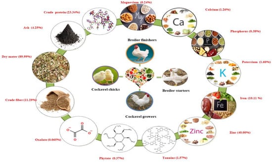 Nworgu and Egbunike [] reported on the nutritional potential of M. invisa leaves by preparing meals for different varieties of cockerel chicks, cockerel growers, broiler starters, and finishers within the years 2004–2009. The diets were formulated for cockerel chicks, broiler starters, and finishers. Leaves were found to be rich in crude protein (23.34%), ash (4.25%), dry matter (89.99%), crude fiber (11.29%), nitrogen-free extract (58.74%), oxalate (0.065%), phytate (0.37%), and tannins (1.57%). High mineral elements were found in M. invisa leaves, including zinc (40.00% of DM), iron (10.11% of DM), potassium (1.60% of DM), calcium (1.26% of DM), phosphorus (0.38% of DM), and magnesium (0.24% of DM). Inclusion of more than 20 g/kg M. invisa leaf meal to the diets of cockerel chicks and cockerel growers resulted in decreased feed intake, weight gain, and feed conversion ratio. Dietary inclusion of leaf meal in broiler starters and finishers resulted in significant reductions in feed, weight gain, and feed conversion ratio. These results were found to be progressive and comparable within different chicken types. A schematic illustration of the nutritional value of the Mimosa genus is presented in Figure 2.
