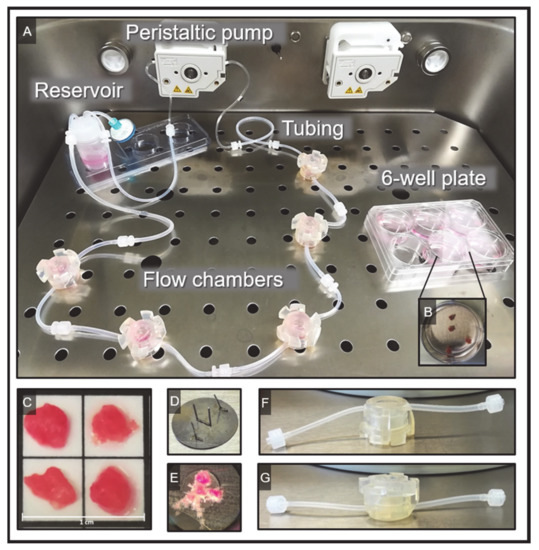 Depiction of the experimental setup. (A) The inside of the bioreactor is shown where temperature and gases are controlled. On the left side of the bioreactor a complete flow cycle is assembled showing the reservoir, the tubing, and the flow chambers as well as the peristaltic pump. On the right side, a six-well plate is used as a static control. (B) The four explants in a static well are shown. (C) Placental villous explants with a cross-sectional diameter of about 0.5 cm are used for the flow and the static explant culture. (D) To prevent sweeping away of the explants in the flow-cycle, a metal plate with needles is used to fix the placental explants. (E) Then, the metal plate with fixed placental villous explants is introduced into the flow chambers. (F,G) The flow chambers are used upside-down (G) to facilitate the direct exposure of explants to the stream of the medium.